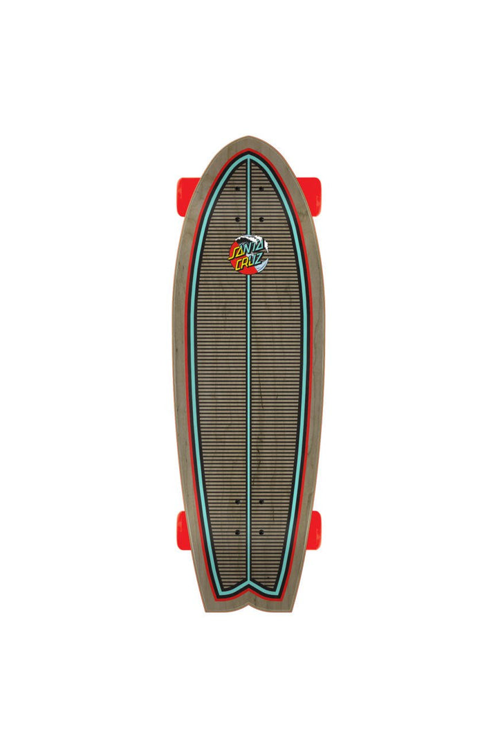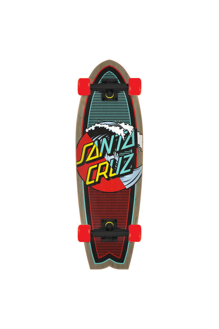 Santa Cruz Skateboards Classic Wave Splice Shark Cruzer with multi-color graphic on 7 ply surfboard inspired shape with 140mm Bullet trucks, angled risers, and 65mm 78a wheels.