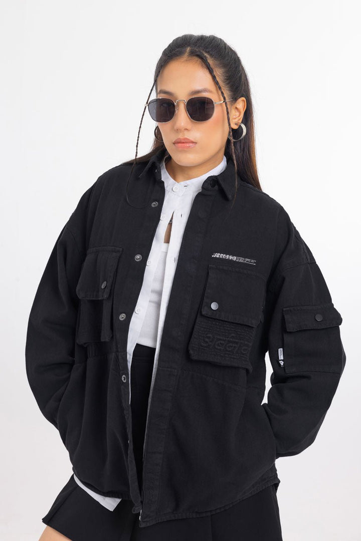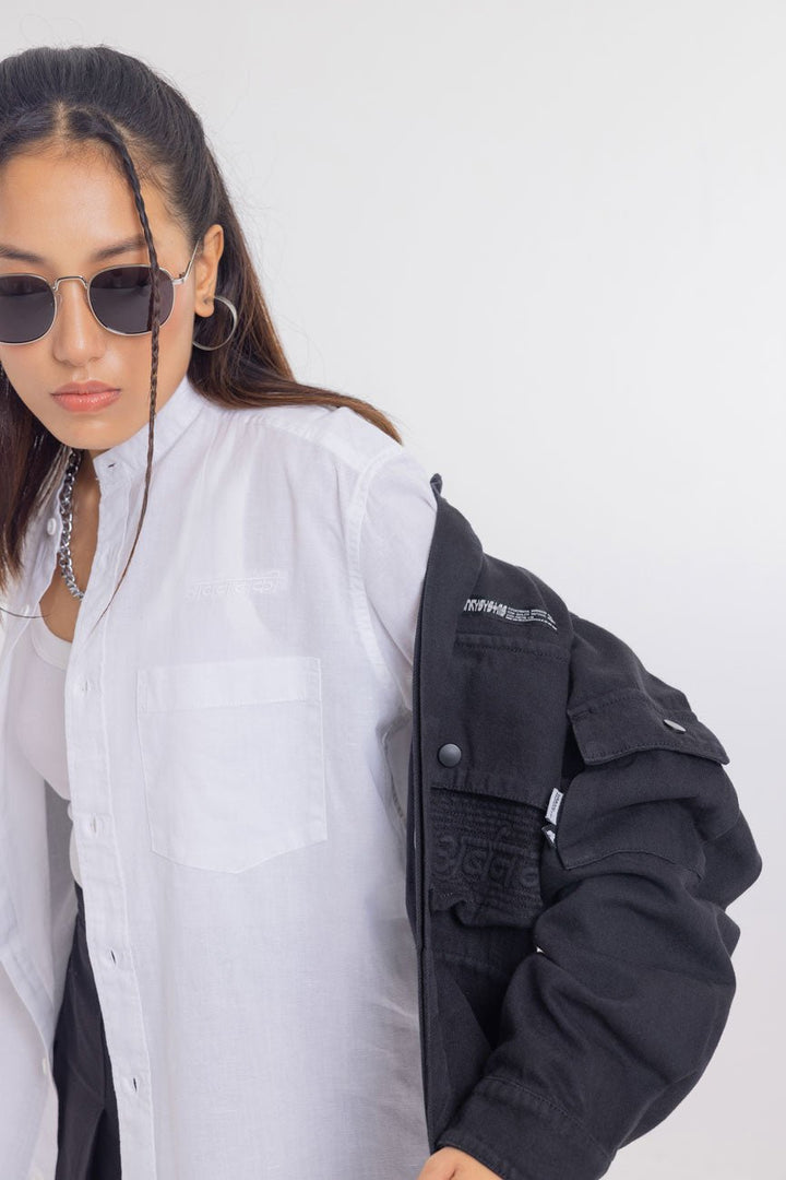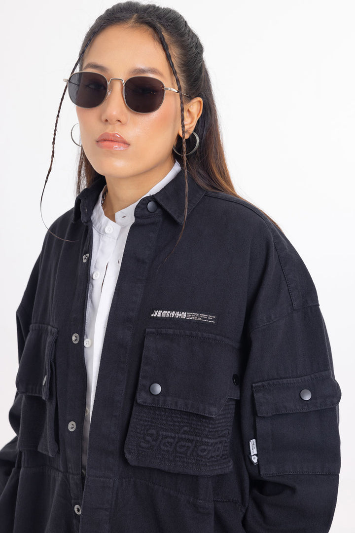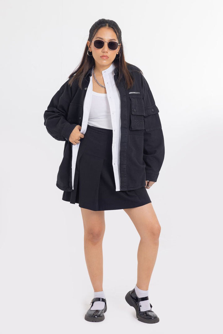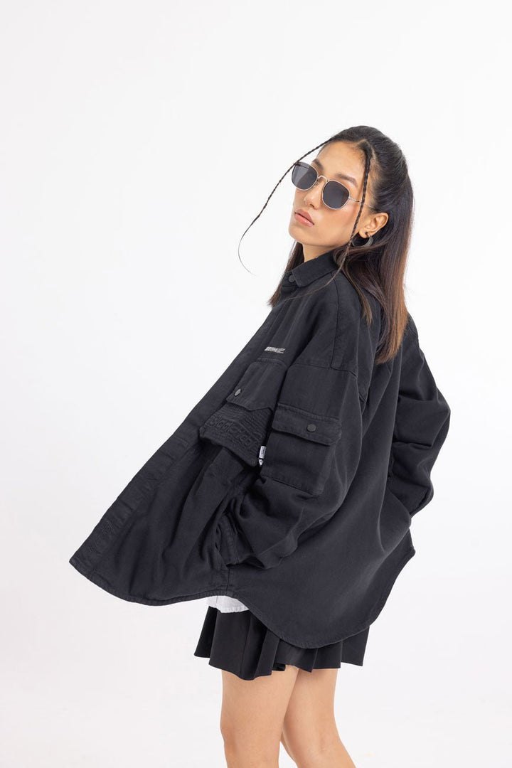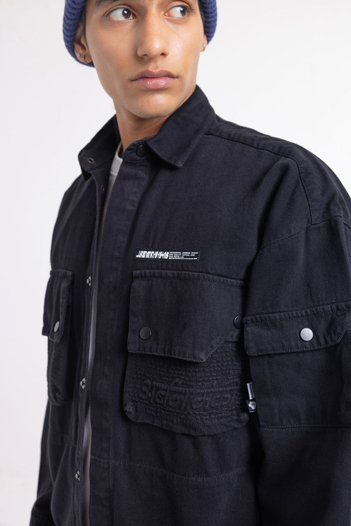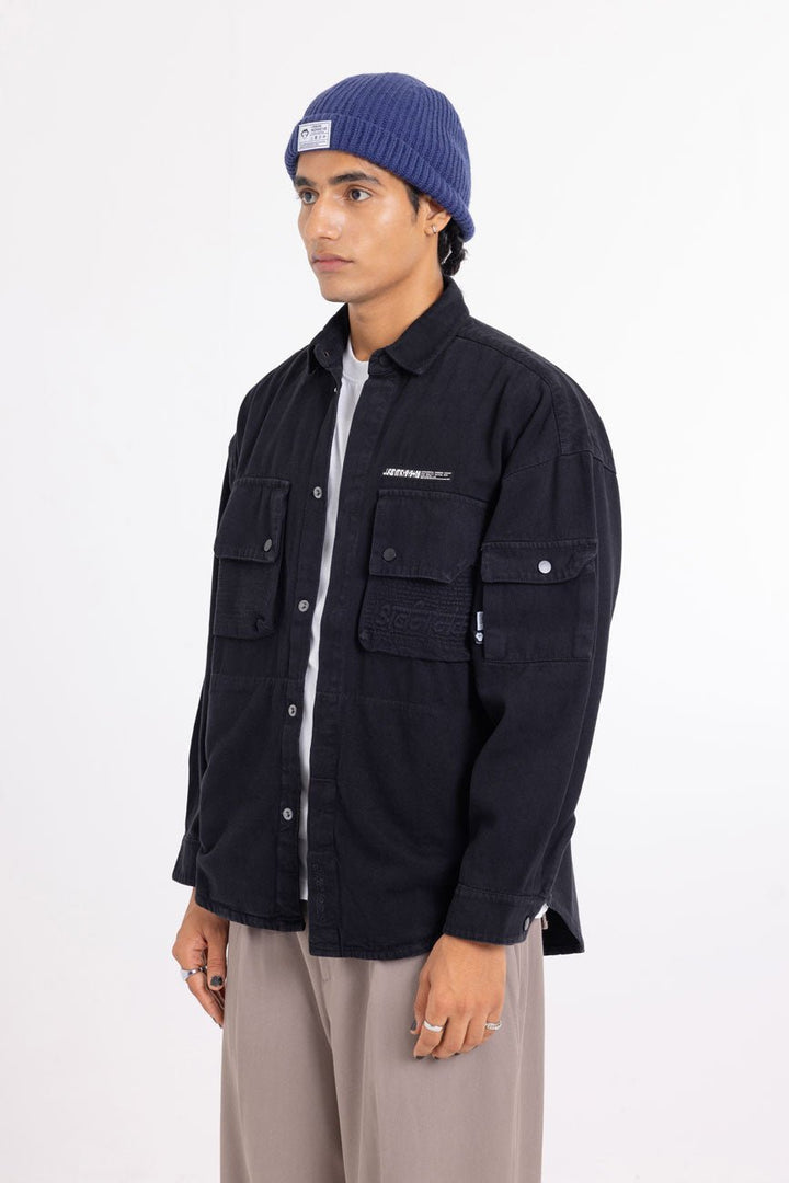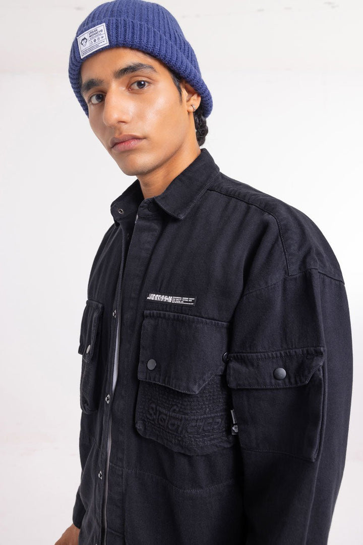 Part of our Urbanmnky-Systms™ collection, this Multi Pocket Black Over Shirt is crafted in heavy weight cotton twill fabric designed to offer a sophisticated laid-back look. Featuring two chest pockets, an added pocket on left sleeve, and brand label patches, this versatile shirt is packed with meticulous signature details. Roomy cut for easy layering. Authentic workwear feel. Made in India