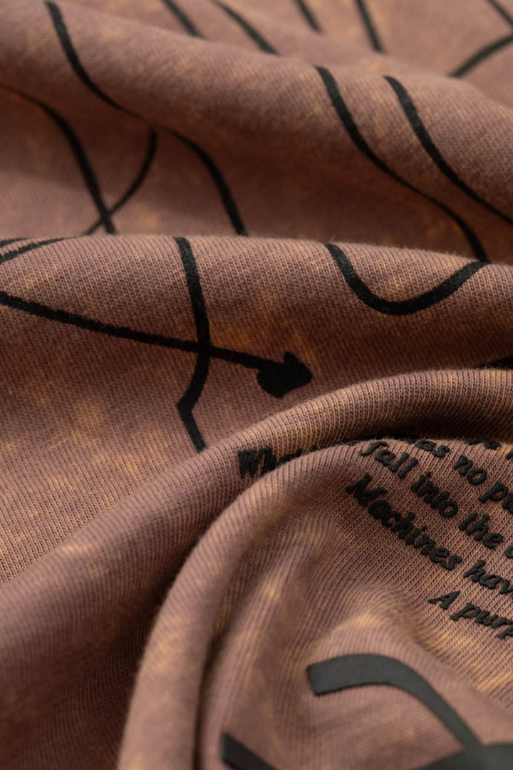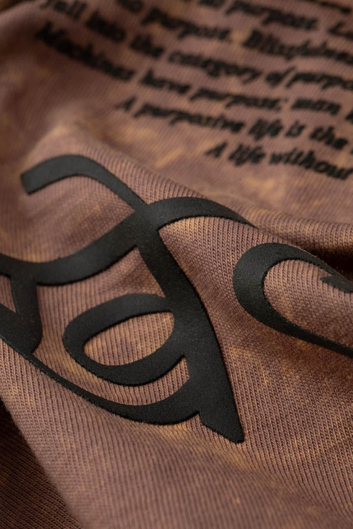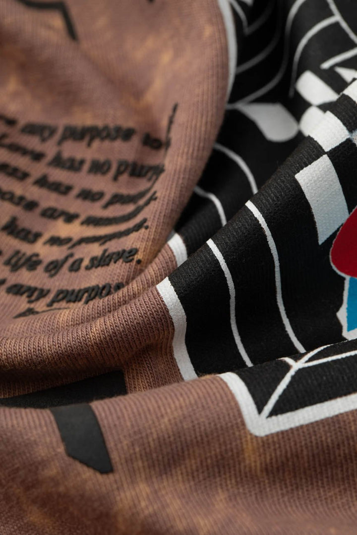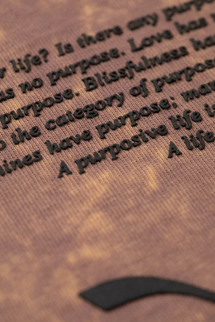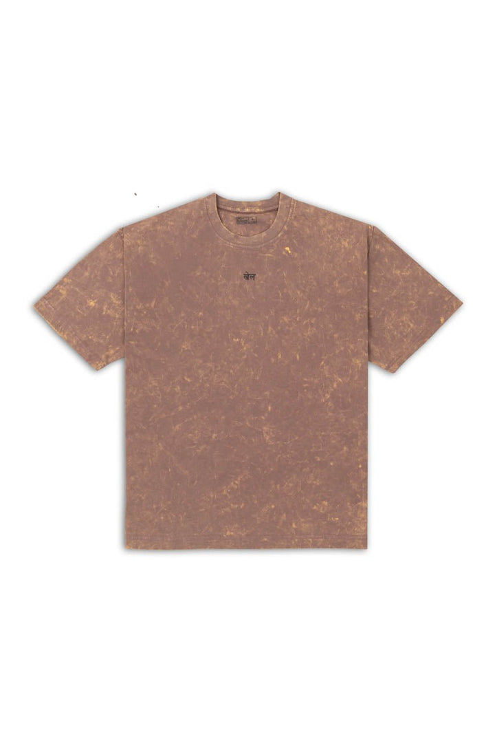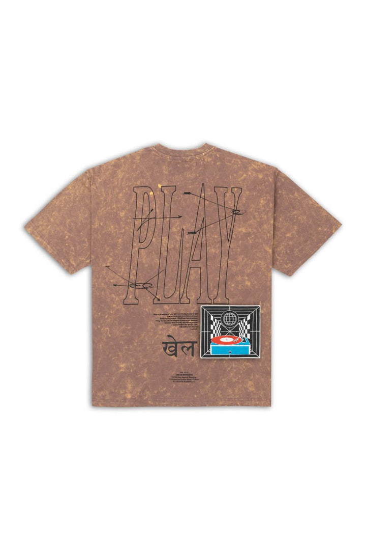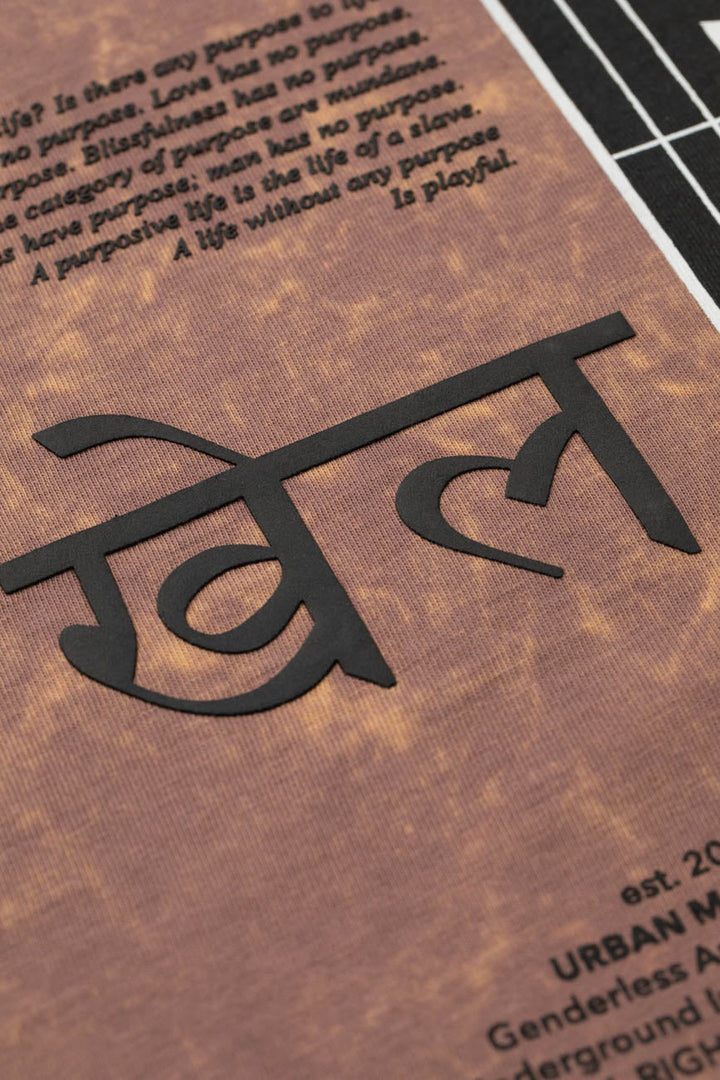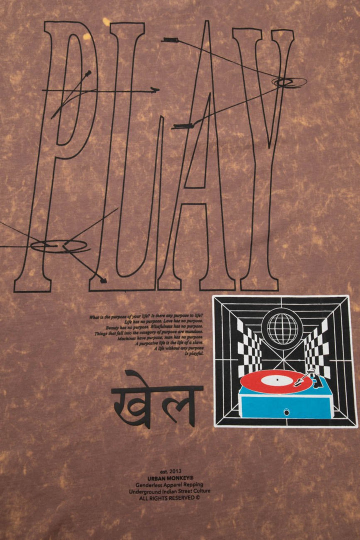 Dipped in pale purple and acid-washed down to imperfection, it wears like a question mark — open-ended and unresolved. The oversized silhouette holds space for contradiction-philosophy rendered in childlike typography with deep thought balanced by a turntable spinning joy in the corner. On the back, the word “KHEL” stands tall  which is a reminder, in two scripts, that maybe life’s not meant to be solved, but to be played with.