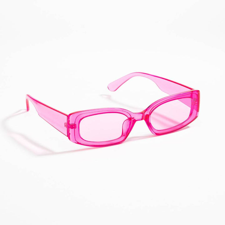 These Classic, chunky rectangle sunglasses are made with high performance PC with a pink finish.