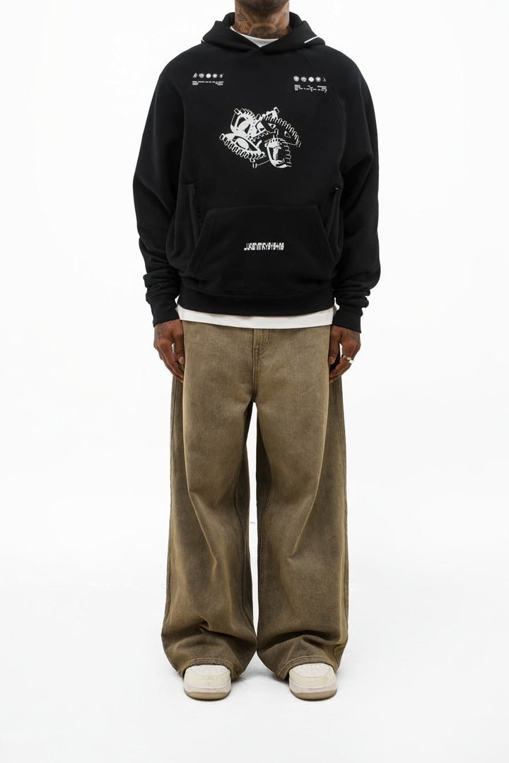 Part of our Urbanmnky-Systms™ collection, this core black hoodie crafted from a weighty cotton blend, goes beyond the basics and pushes the boundaries of design. We experimented with the traditional kangaroo pockets in a hoodie. Result? A hoodie engineered with two additional hidden zipper pockets for added utility and extra storage. These thoughtfully engineered zipper pockets make convenience take center stage.