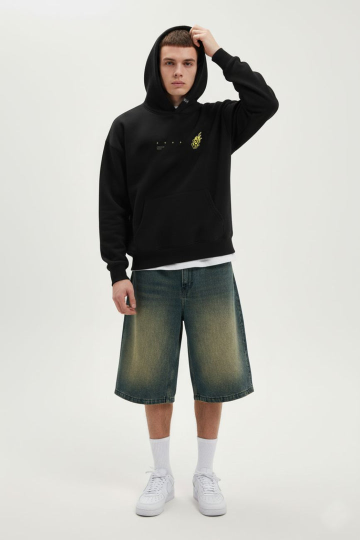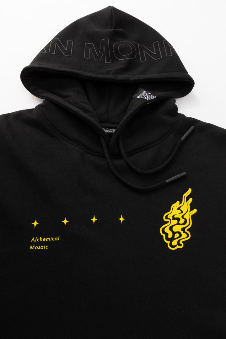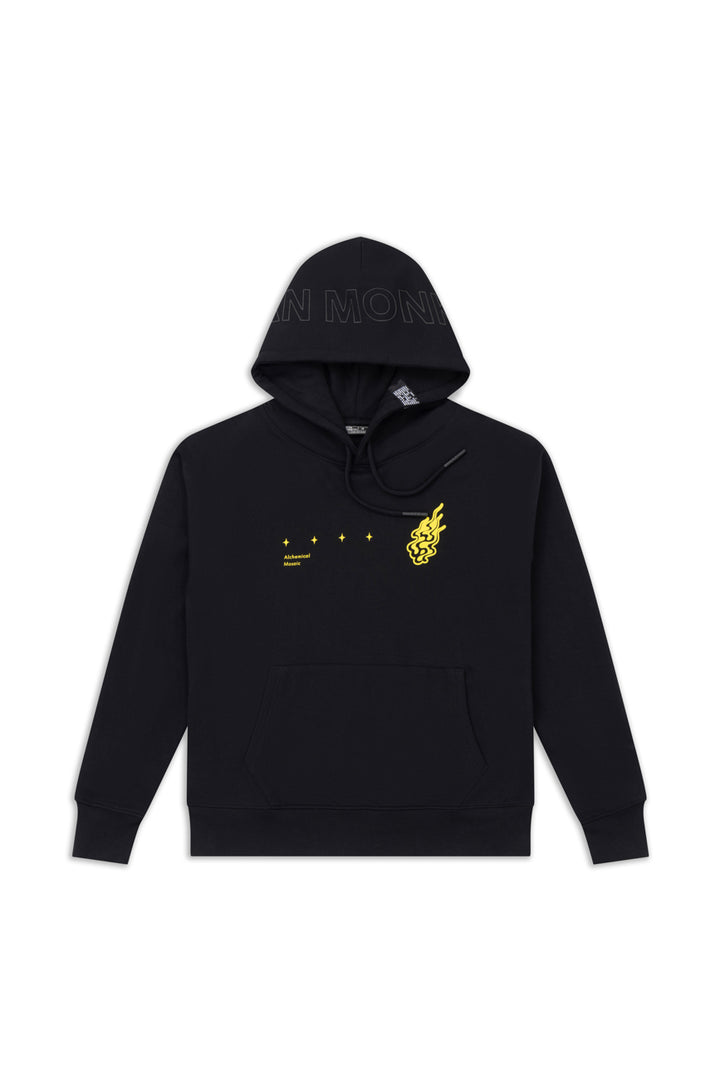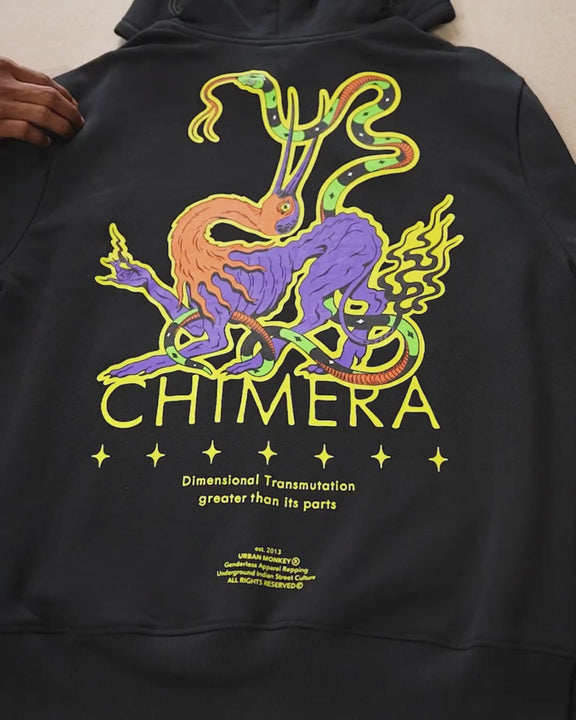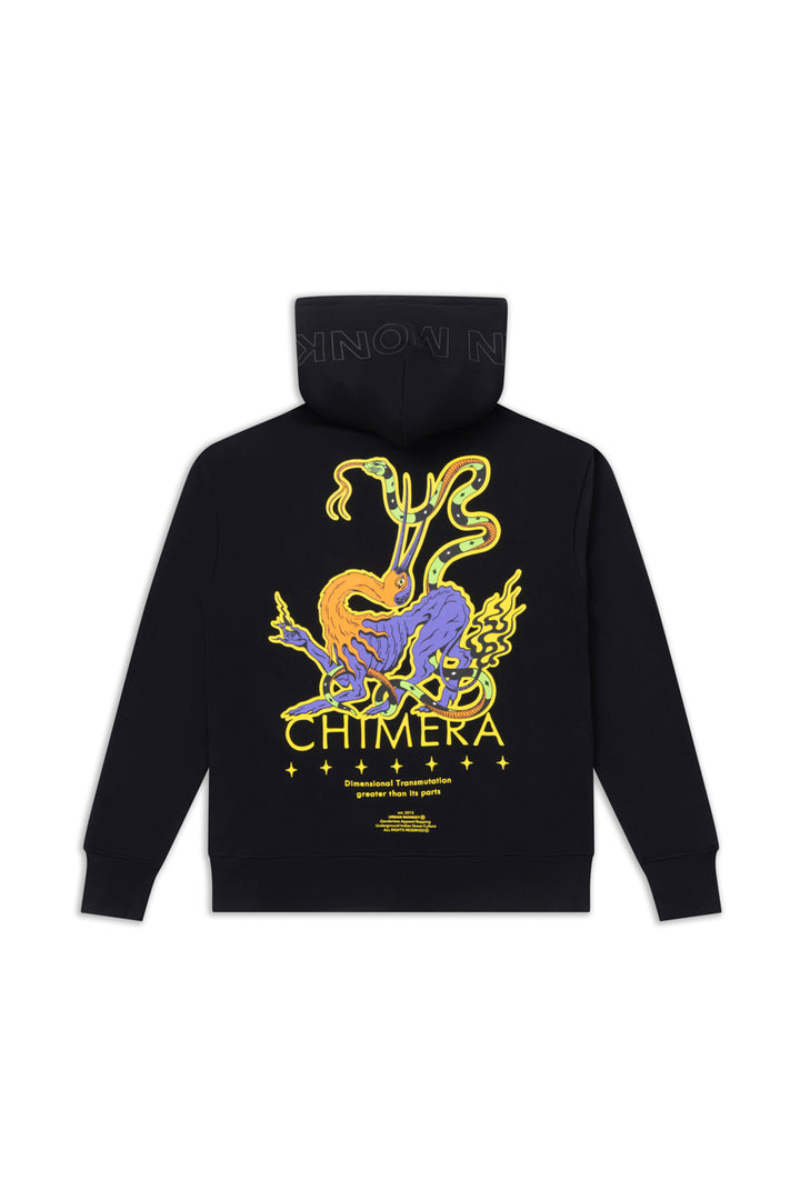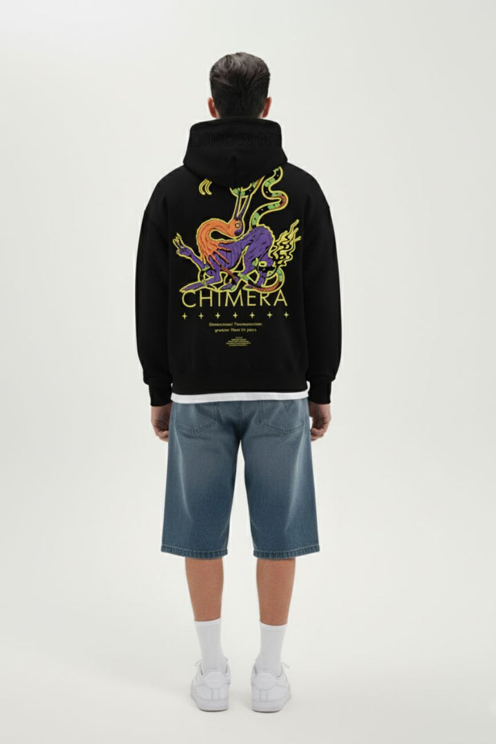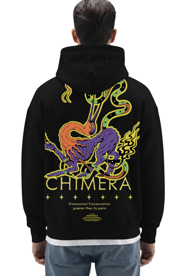 The Chimera Hoodie takes the energy of the Chimera Tee by Moebius and brings it into a colder-weather staple. Crafted in jet-black brushed fleece, it carries the same surreal, mythic artwork that defined the tee, a bold creature woven from imagination, chaos, and movement. The front stays minimal with UM Core detailing, while the back explodes with the full Chimera graphic, a piece of wearable art that feels alive every time you put it on.