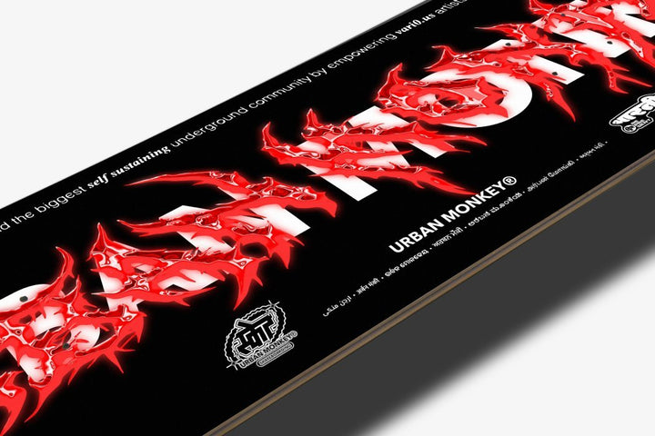 The Courage skateboard deck by Urban Monkey is a high-quality board made from 100% Canadian maple. Crafted from premium-quality Canadian maple, whether you're cruising through the streets or hitting the skatepark, this deck is incredibly durable and built to withstand the wear and tear of daily use. The wood is lightweight, providing a comfortable and responsive ride that will help you perform your best tricks. This deck boasts a striking design that perfectly captures the spirit of the brand: bold, edgy, and unapologetic.