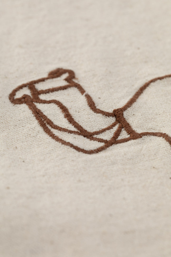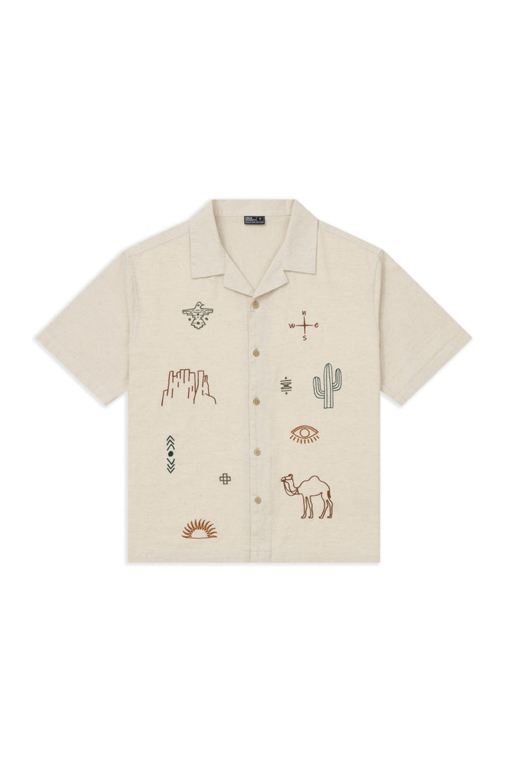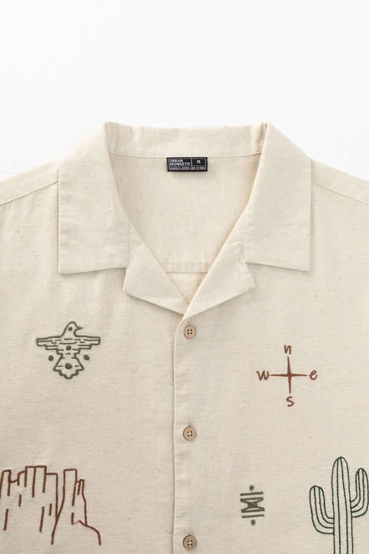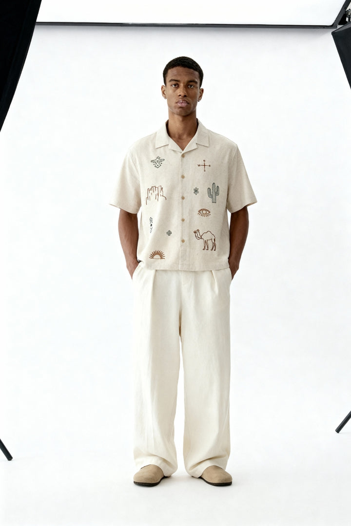A soft-spoken tribute to desert trails and ancient rhythms. This cotton-linen shirt carries tales in its threads — camels, cacti, sunbursts, and symbols embroidered in earthy tones. The relaxed camp collar and coconut shell-look buttons ground the piece with ease. Every detail feels weathered by sun and story, designed to wander with you — from still mornings to long, golden dusks.