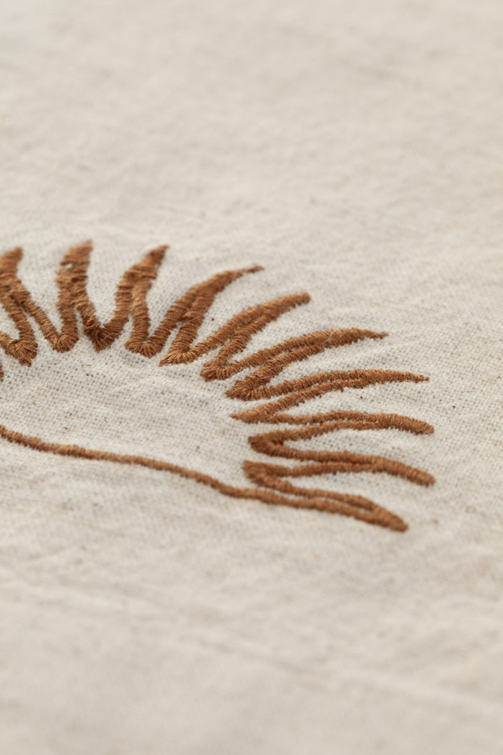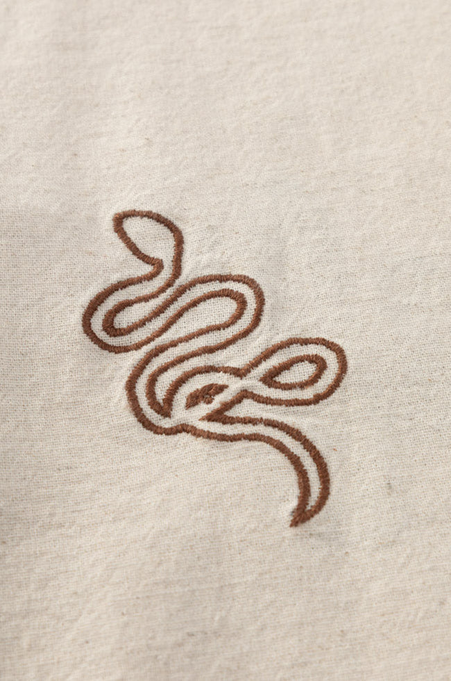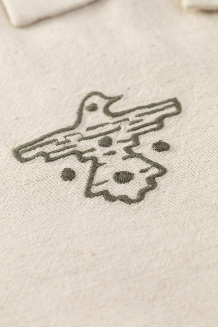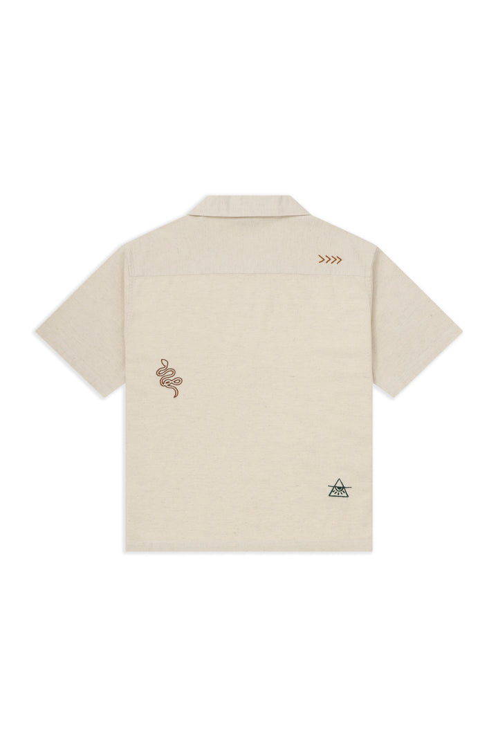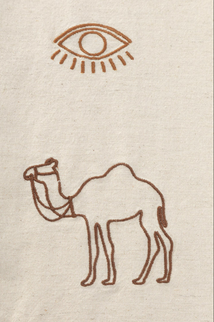 A soft-spoken tribute to desert trails and ancient rhythms. This cotton-linen shirt carries tales in its threads — camels, cacti, sunbursts, and symbols embroidered in earthy tones. The relaxed camp collar and coconut shell-look buttons ground the piece with ease. Every detail feels weathered by sun and story, designed to wander with you — from still mornings to long, golden dusks.