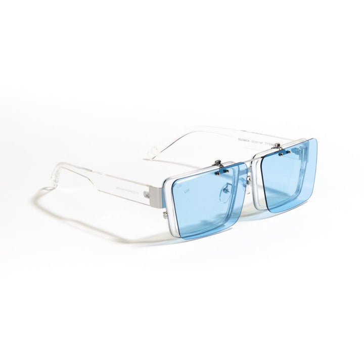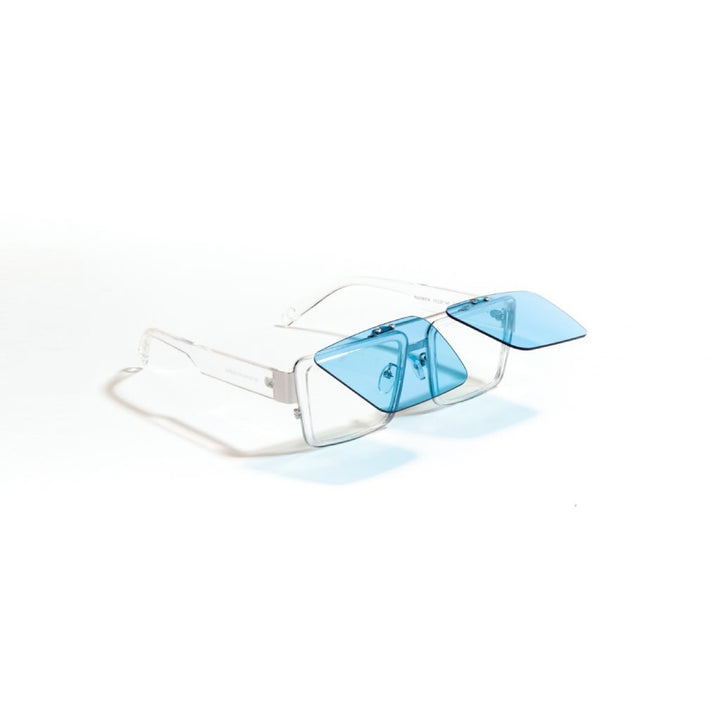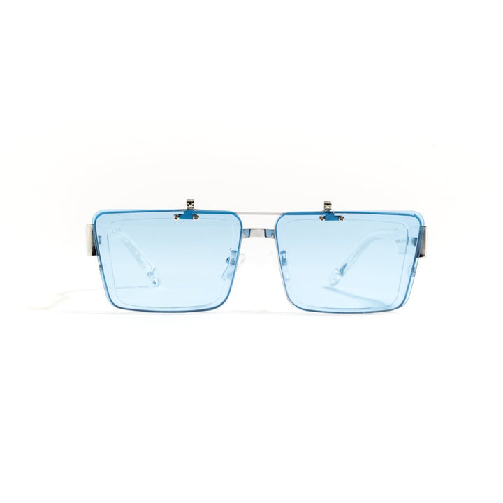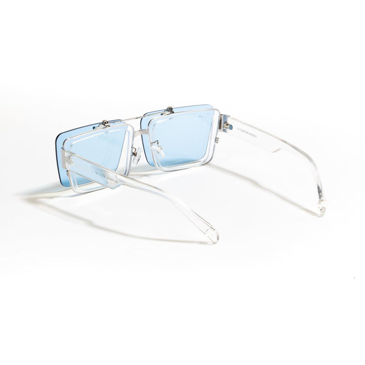 Evoke your 70s glam with our retro styled Happy Hippie //001 sunglasses that feature clear square lenses with blue vintage style flaps and a brow bar.