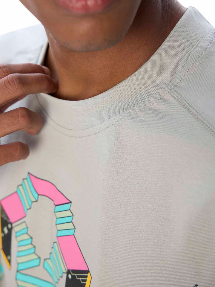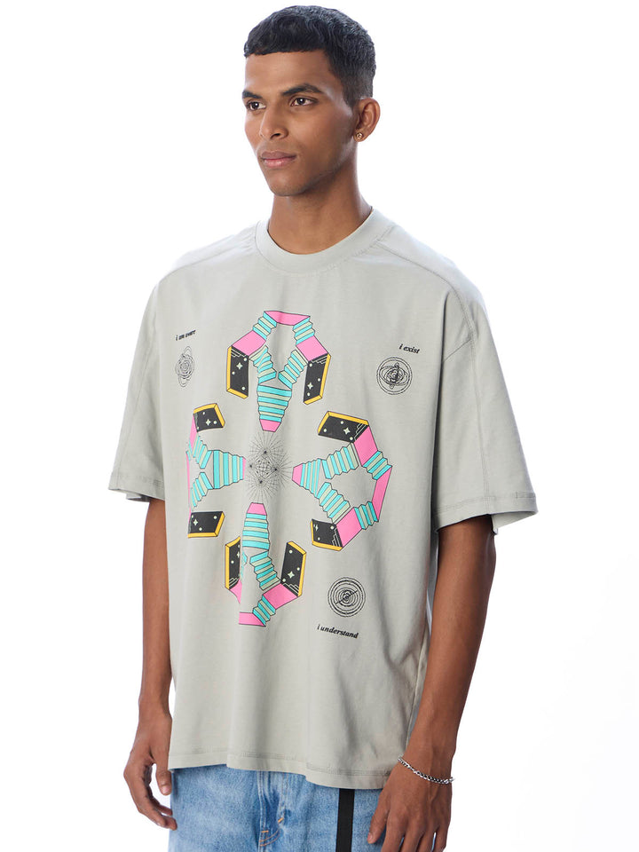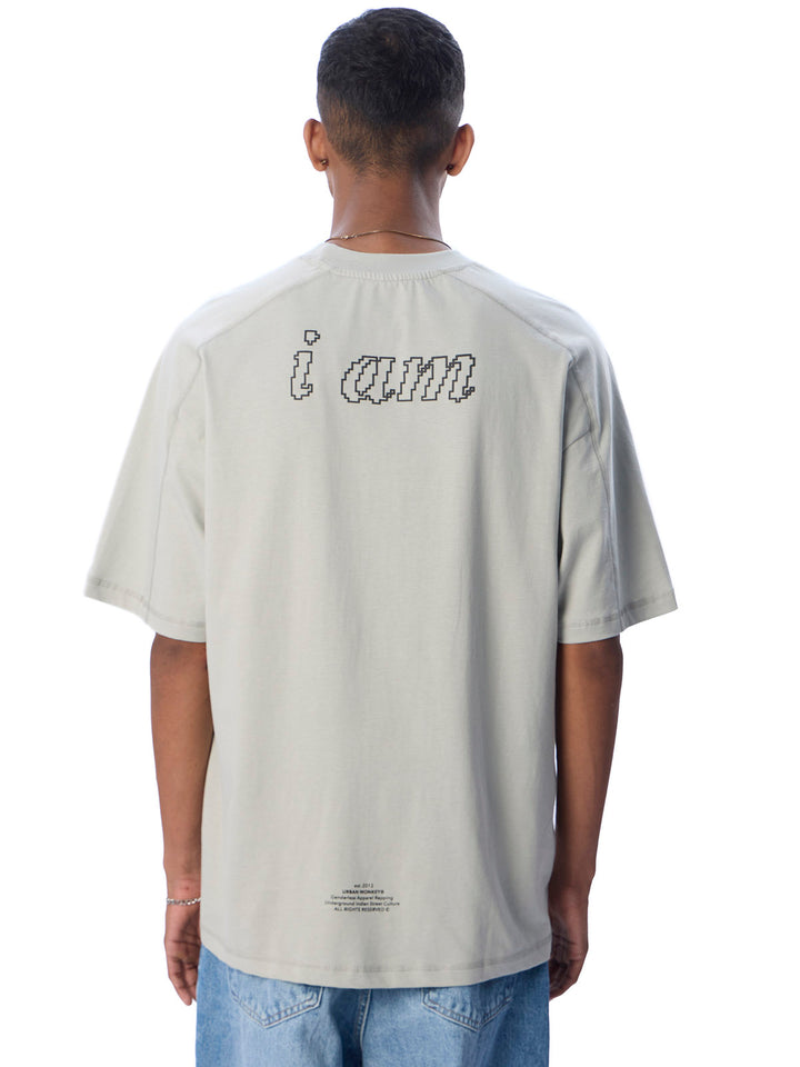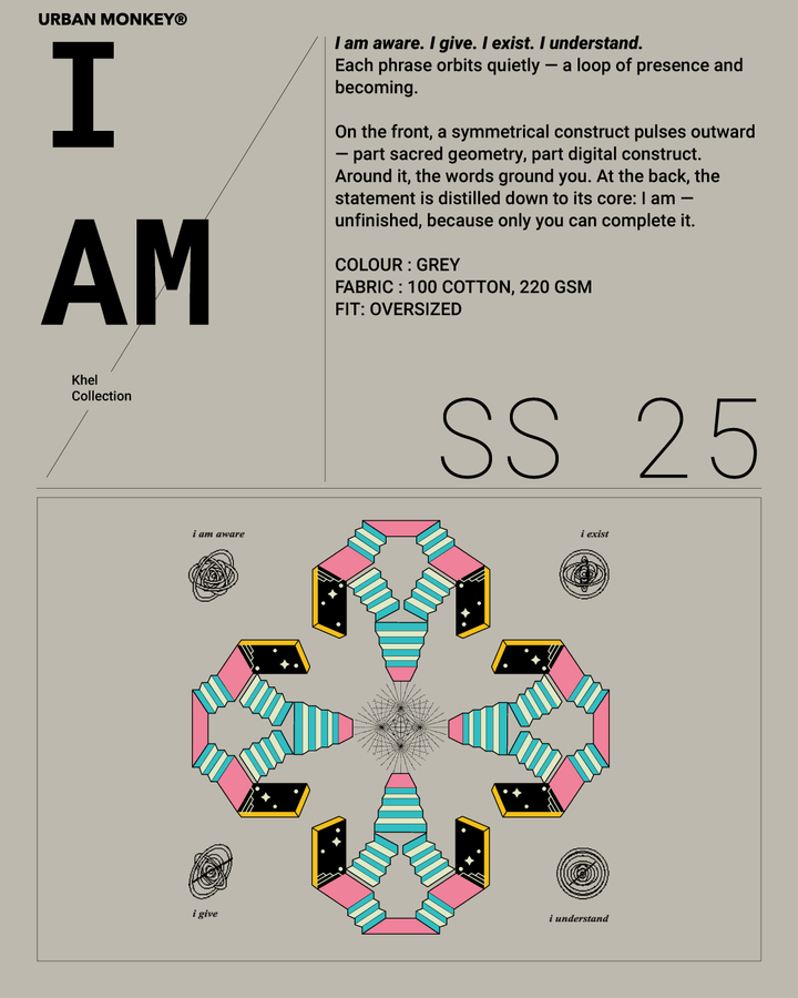 I am aware. I give. I exist. I understand. Each phrase, stitched into its own orbit, forms a quiet affirmation. Together, they create a loop — one that centers presence, reflection, and choice. This tee isn’t just about identity, it’s about witnessing the process of becoming. On the front, a symmetrical construct pulses outward — part sacred geometry, part digital construct. Around it, the words ground you. At the back, the statement is distilled down to its core: I am — unfinished, because only you can complete it.