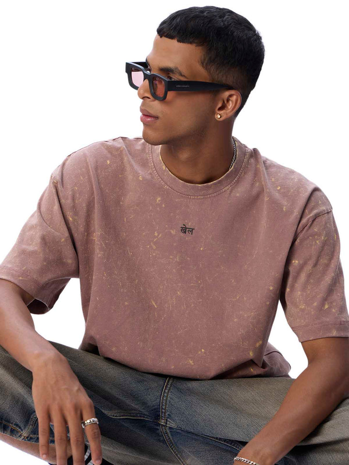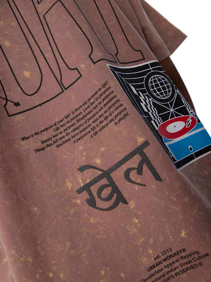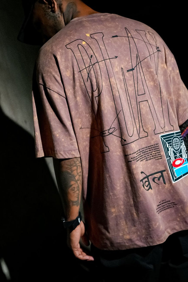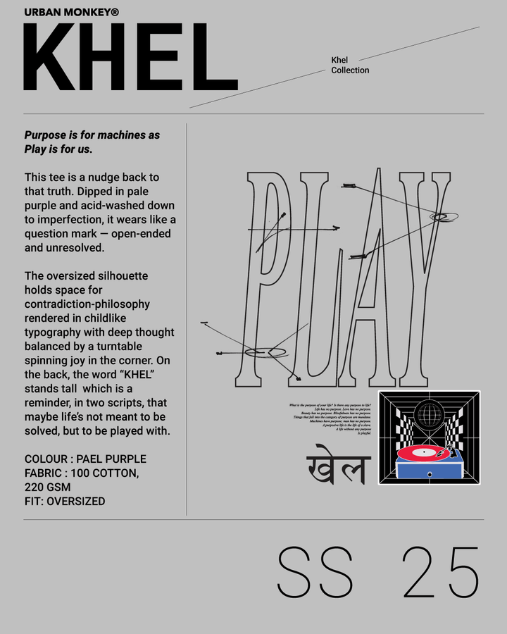 Dipped in pale purple and acid-washed down to imperfection, it wears like a question mark — open-ended and unresolved. The oversized silhouette holds space for contradiction-philosophy rendered in childlike typography with deep thought balanced by a turntable spinning joy in the corner. On the back, the word “KHEL” stands tall which is a reminder, in two scripts, that maybe life’s not meant to be solved, but to be played with.
