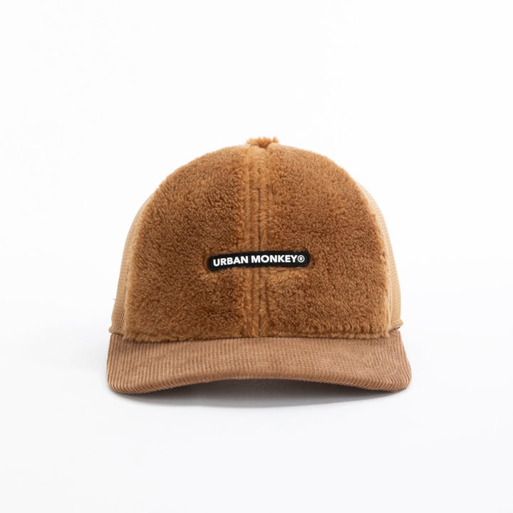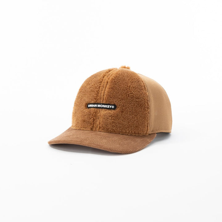 - detail: faux fur front panel, mesh foam back, corduroy brim