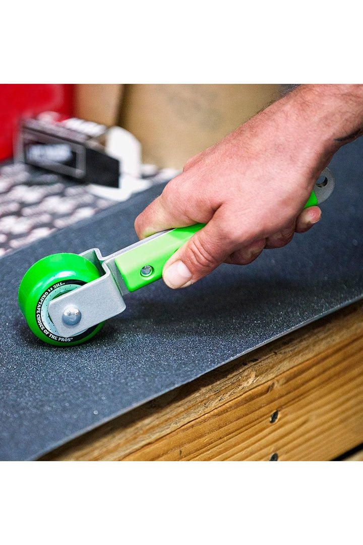 Achieve maximum bonding pressure when applying your MOB Grip with this handy grip tape roller tool. Made to mimmick the DIY versions made a skateshops in the 1980s, the Mob Griptape Roller features a smooth rolling medium-soft wheel and bearing unit with metal bracketing and skateboard rail handles