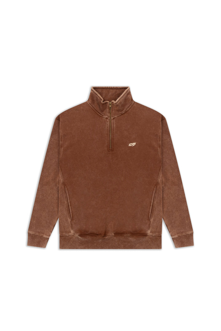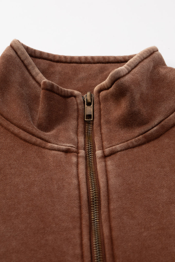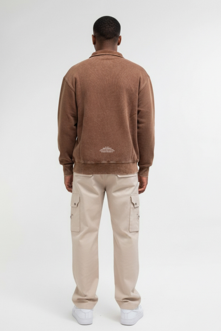 The vintage washed mocha Sweatshirt brings vintage comfort into the now. Crafted in heavy brushed fleece and finished with an antique acid wash, it feels like a piece you’ve owned forever but holds up like new. The high neck and metal zipper add a touch of utility, while diagonal cut-and-sew panels and welt pockets keep the design functional and clean. Subtle UM embroidery in pastel yellow ties it back to its roots. Made to age beautifully and wear effortlessly, it’s a staple built on timeless design.