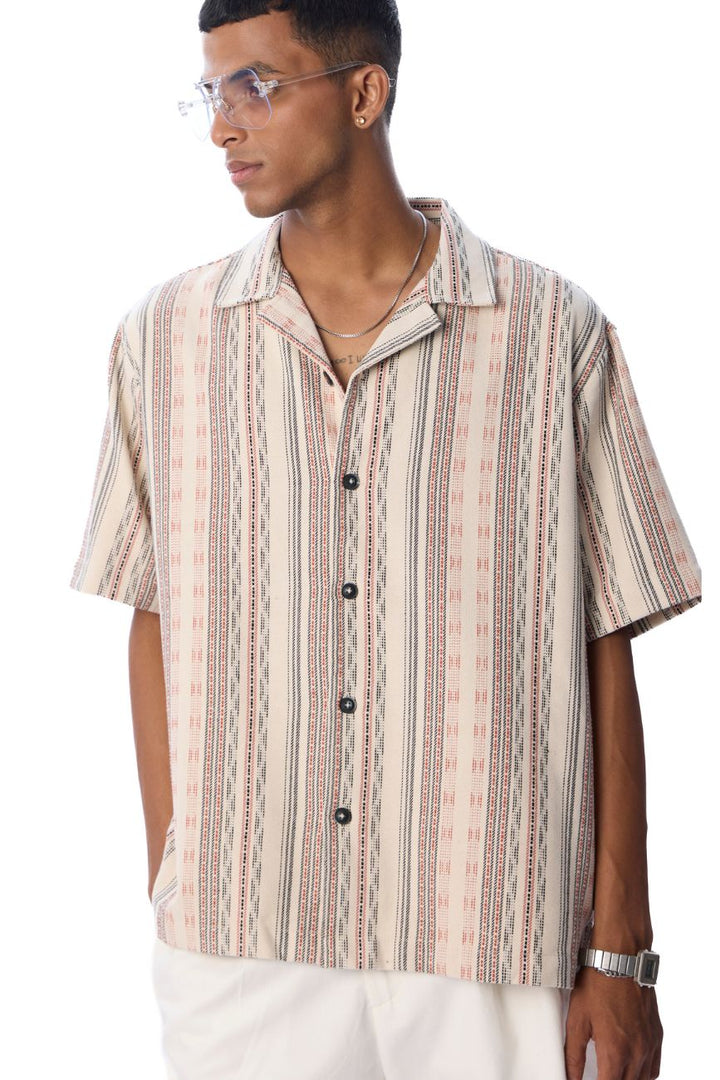 A breezy button-down shirt built for days that unfold slowly. With retro jacquard stripes running across a crisp white base, this shirt is cut in a relaxed fit with a clean resort collar for that laid-back, always-on-vacation vibe. The cotton-viscose blend keeps things breathable and drapey. Finished with contrast buttons, a woven side label, and side slits for easy movement.