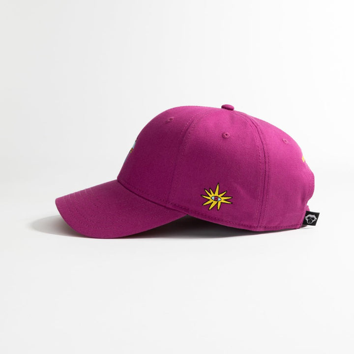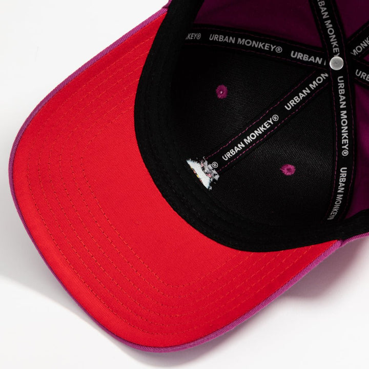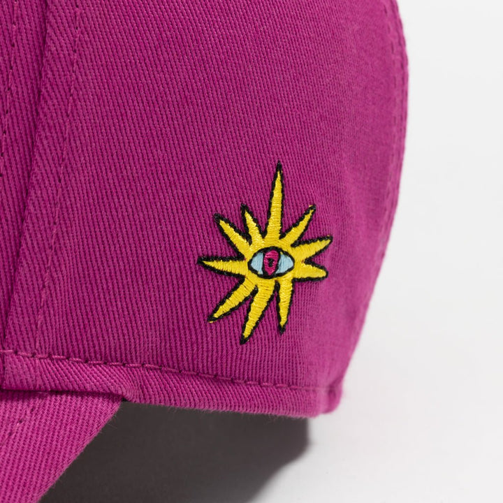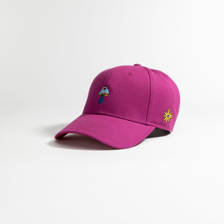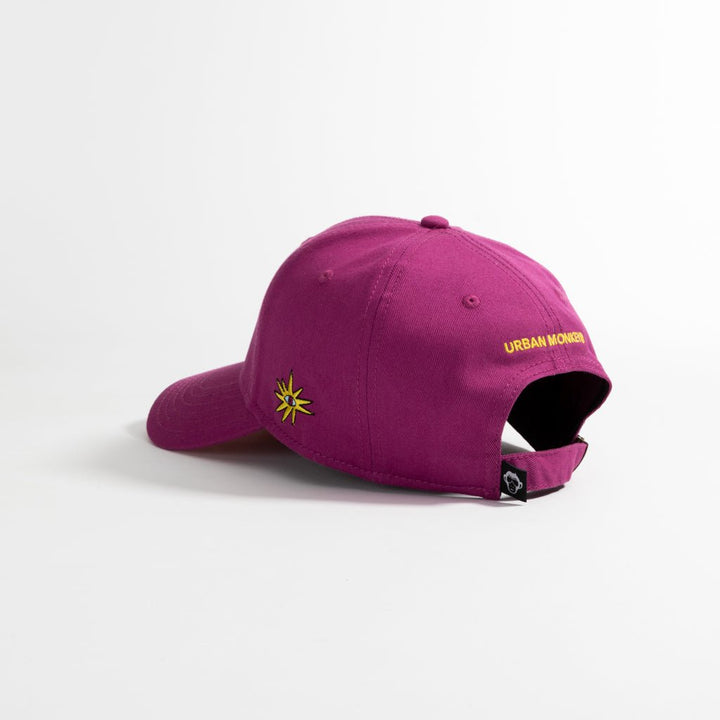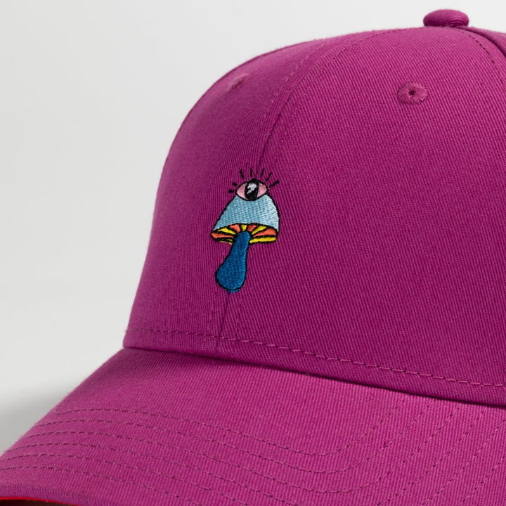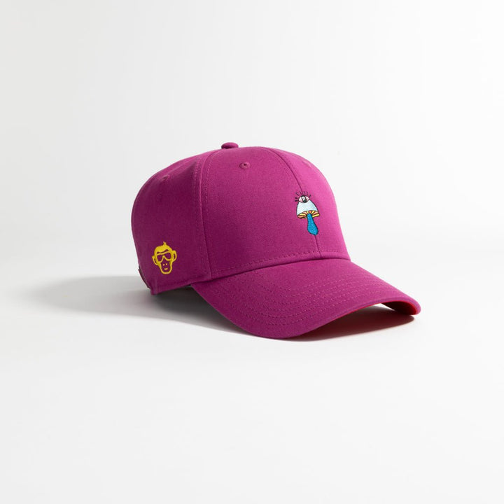 This classic magents/purple baseball cap by Urban Monkey featuring a magic mushroom and evil eye was designed for the happy souls. Featuring a curved peak, high definition embroidery, an adjustable strap and embroidered logo to the back. Have a nice trip!