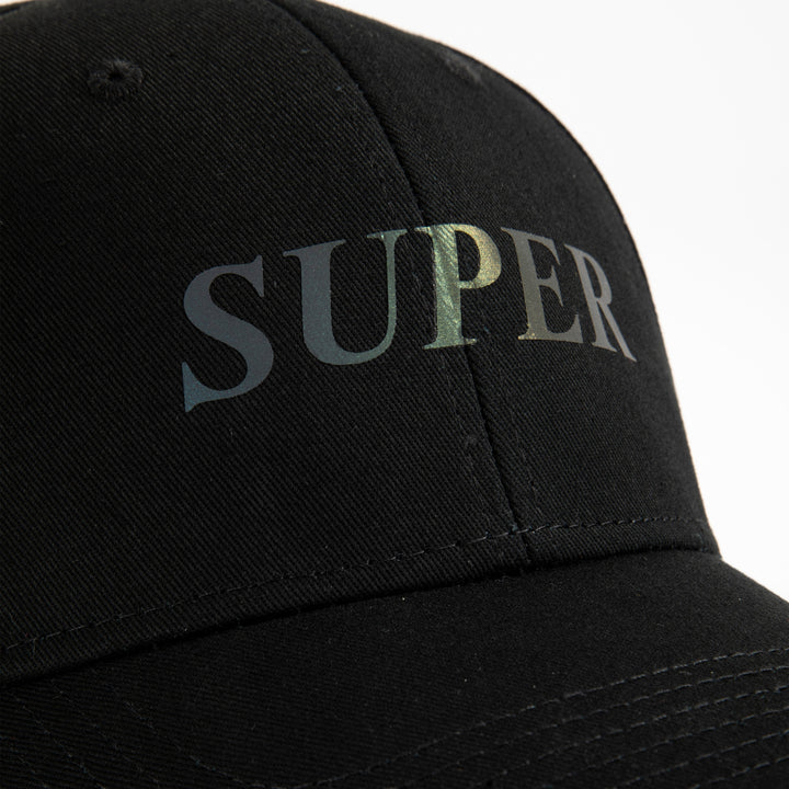 There's no Urban Monkey's collection without a black baseball cap and there shouldn't be a wardrobe without one either. Crafted from 100% premium cotton featuring the word 'SUPER' printed in intense chrome which glows under light is here to make a statement. Finished with stitched eyelets on the front panel for breathability and an adjustable snapback closure to achieve the perfect fit this cap is also equipped with a sweat band.