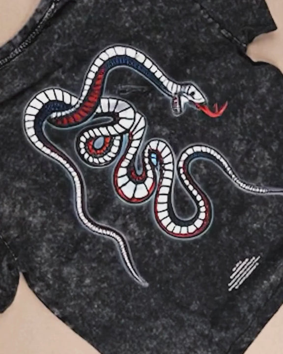 The Tail-Eater tee draws inspiration from the timeless myth of the serpent devouring its own tail which is a symbol of eternity, transformation, and self-destruction. Finished with a signature acid wash, the black base carries a faded, lived-in texture that makes every piece unique, enhancing the raw edge of the design. At its core lies a deeper truth: unchecked pride and endless hunger can trap us in cycles we cannot escape. The serpent, once a force of power, becomes a prisoner of its own desire — a mirror of the human tendency to spiral inward when ego overshadows clarity.